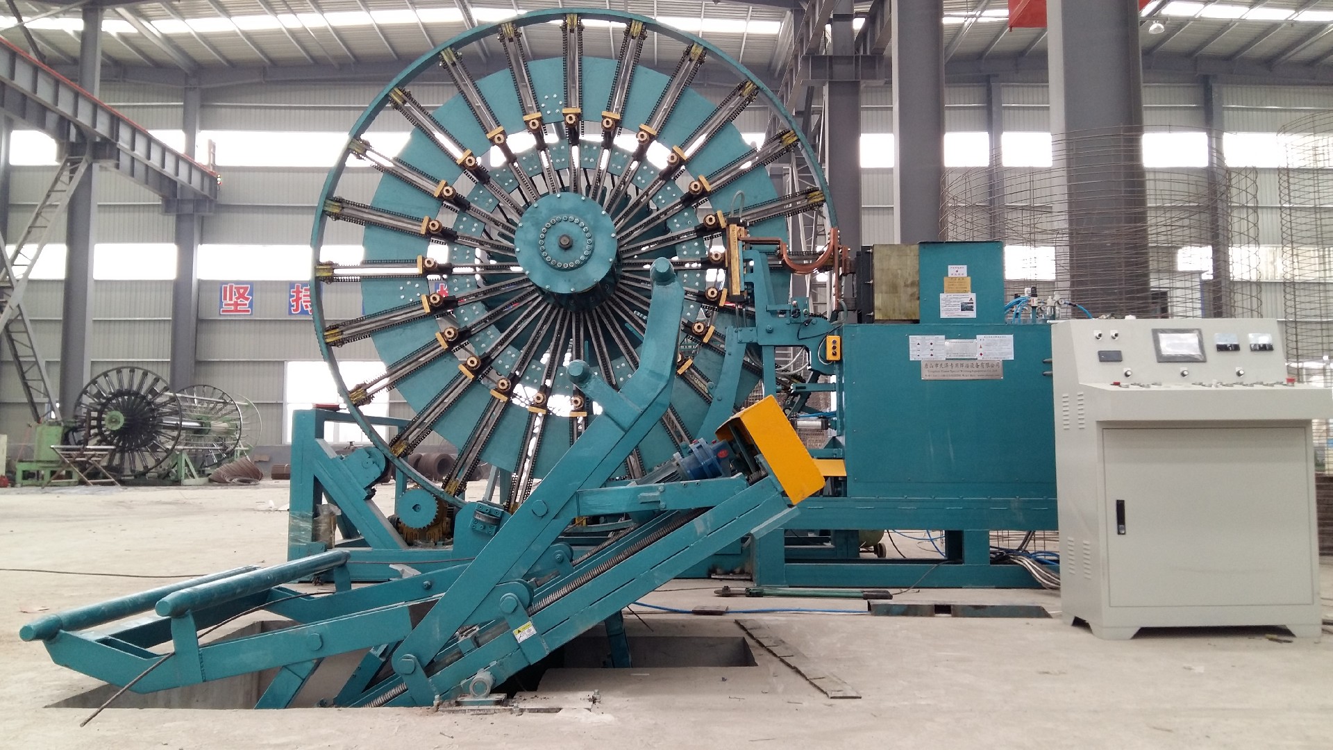 我公司生產(chǎn)的排水管滾焊機(jī)的可翻轉(zhuǎn)電動(dòng)托籠架,因其方便,減輕勞動(dòng)強(qiáng)度等優(yōu)勢(shì)已在國(guó)內(nèi)外用戶中廣泛使用。但焊完的鋼筋籠卸到地面的問(wèn)題,還未能解決,還需借助人力操作或起重設(shè)備(大型鋼筋籠時(shí))完成卸籠,人力卸籠時(shí)勞動(dòng)強(qiáng)度很大,且存在一定的危險(xiǎn)性,而我們研制的排水管滾焊機(jī)的可翻轉(zhuǎn)電動(dòng)托籠可以實(shí)現(xiàn)鋼筋籠下降并自動(dòng)翻滾至地面,大大減輕工人的勞動(dòng)強(qiáng)度,而且有效,不會(huì)損傷鋼筋籠。